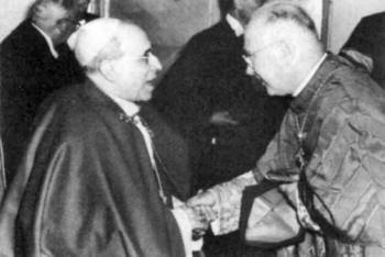 New York's powerful Cardinal Spellman shakes hand of Pope John XXIII, who succeeded Pope Pius XII.