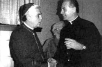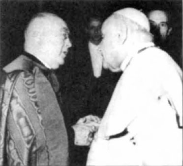 Pat Robertson meets with Red Chinese Premier Zhu Rongji in 1998. The 700 Club host has invested millions of dollars in Red China and supports its policy of forced abortions, all the time pretending to be "pro-life." The cover of Stephen Knight's expose, The Brotherhood—The Secret World of the Freemasons. This book caused a sensation and a furor upon its publication because Knight revealed that the police, judiciary, and government of Great Britain are riddled with Freemasons who give job preference and show official favoritism to their Masonic cohorts. Pope Pius XII greets Cardinal Spellman of New York.