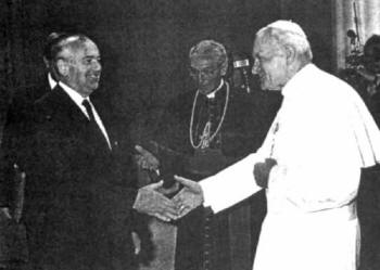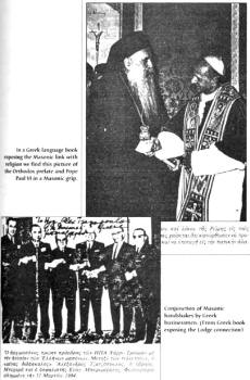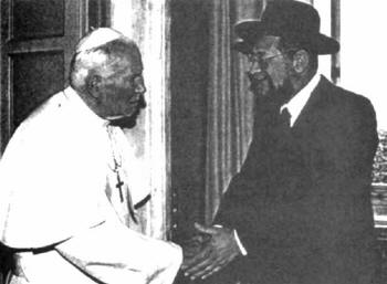 The late Pope John Paul II greets Archbishop Charles Salatka and they share the Real Grip of a Fellow Craft Mason. Simultaneously, the Pontiff gives the "cover grip" with his left hand to conceal the maneuver. Soviet President Mikhail Gorbachev and Pope John Paul II combine to present a Masonic symbol in this staged event for the TV cameras. (Photo: The New York Times, October 1, 1989) Pope John Paul II meets with Israel's Chief Rabbi, Yisrael Meir Lau, at the papal retreat in Rome. As is customary of members of the Grand Lodge of Jerusalem, the rabbi disguises the Masonic hand grip with his left hand.