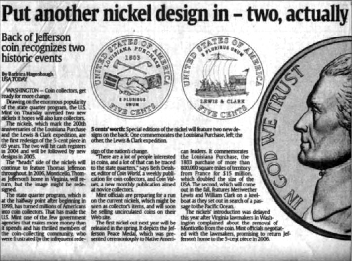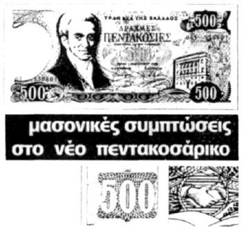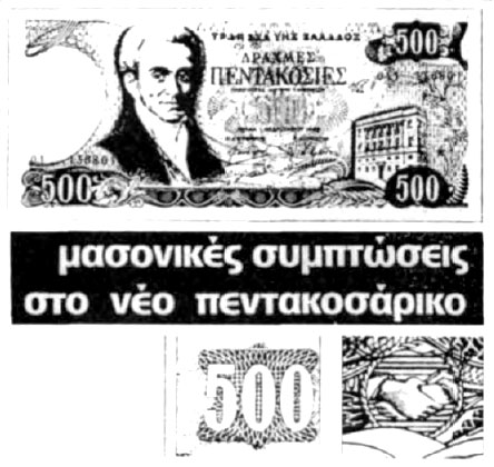 Boston's Cardinal Bernard Law and Catholic Priest Paul Shanley exchange greetings. Subsequently, Shanley, a founding member of NAMBLA, was exposed as a pedophile criminal and convicted of molesting young altar boys. Meanwhile, Cardinal Law, forced by public scorn to leave the United States, was promoted to a top position inside the Vatican. At the death of Pope John Paul II in April 2005, Law surfaced once again, being given the high-visibility role of conducting a mass for the dead Pontiff that was viewed around the world on TV. This was the Vatican's way of retorting to those angered or concerned over priest pedophelia: "Get Lost!" American coinage and currency frequently has borne hidden messages and symbols of the llluminati. This new clipping from USA Today newspaper discusses and pictures the new nickel (5c coin) released in 2004 to commemorate the Louisiana Purchase of 1803. The coin bears the image of the Masonic handshake and also the occultic "X." Masonic handshake imbedded in Greek 500 d. note. This drawing of the ancient Babylonian God, Nebo, from a dictionary of the Bible, makes him appear to be instructing adepts on the finer points of using hand signs or exchanging mysterious grips. In fact, Nebo's title was "Interpreter of the Gods," and he was said to be the God of learning and of letters. The biblical King Nebuchadnezzar in the book of Daniel was named after Nebo. This cut is in the British Museum, London.