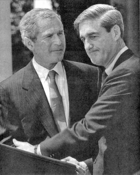 Mormonism's founder, Joseph Smith, was a Mason, and all Masonic authorities today acknowledge the similarity of the two groups' rituals, symbols, signs, and doctrines. President George W. Bush and FBI Director nominee Robert Mueller exchange grip behind podium. (Photo: The Washington Post, July 22, 2001)