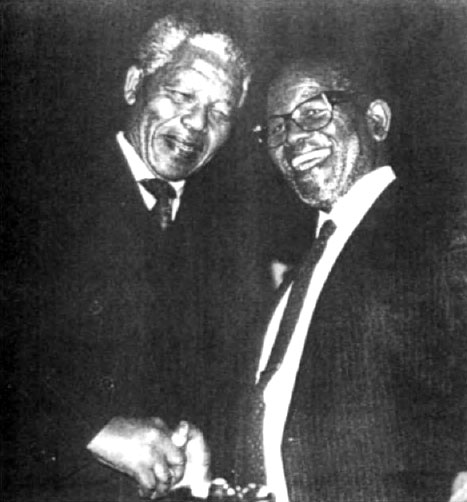 In August, 2000, Prime Minister Ehud Barak of Israel in a clear Masonic hand grip with Jordan's King Abdullah as they meet in Amman, Jordan. All Prime Ministers of Israel since the formation of that nation in 1948 have been initiates of the Masonic Lodge. All have been recruited into the Order of the llluminati, also. (Photo: Associated Press, in Austin American-Statesman, August 17, 2000, p. A3) European Farm Commissioner Franz Fischler (left) in handshake with German Agriculture Minister Karl Heinz Funke at a European Community session in Brussels, Belgium. (Photo: Spotlight newspaper, December 7, 1998) Nelson Mandela, political leader of South Africa, shakes hands (Masonic) with South African Communist Party leader Oliver Tambo. Mandela, lionized by the Western Press, is a life long Communist activist and a known terrorist criminal. Mandela acquired power at the helm of the South African government by arrangement with the heads of the llluminati's Rockefeller, Rothschild, and Oppenheimer dynasties.