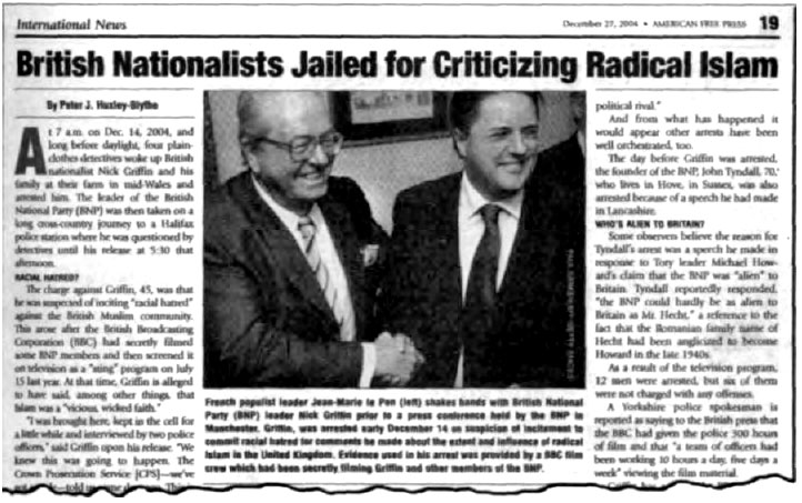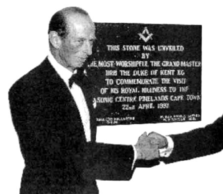 Kofi Annan is married to a white woman, a Rothschild heiress.(Photo: USA Today, September 22, 1998, p. 11A) Great Britain's Duke of Kent, head of the United Lodge, the largest Masonic fraternity in England, holds the title, The Most Worshipful Grand Master. The Duke is sharing a Masonic grip on visit to Cape Town, South Africa. Frenchman Jean-Marie le Pen (member of Paris' Grand Orient Lodge) warmly welcomes Masonic brother Nick Griffin, leader of the British National Party (BNP). Jean-Marie le Pen, head of a supposed right-wing populist party in France, is oft criticized in that country's press for what they say are his anti-Semitic views.