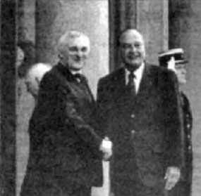 French President Jacques Chirac, Masonic initiate of Paris' Grand Orient Lodge, with Irish Prime Minister Bertie Ahern (left). Shimon Peres, former Prime Minister and leader of Israel's Labor Party (left), in Masonic grip with Morton L. Janklow of the Council on Foreign Relations (CFR). (Photo: CFR Annual Report, 1990)
