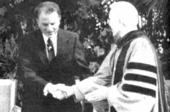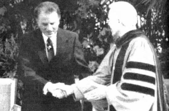 The three were Billy Graham, Norman Vincent Peale, and Robert Schuller. Statues of the three Masons have been erected in the courtyard of the Crystal Cathedral in Garden Grove, California. Evangelist Billy Graham shares an indisputably Masonic handshake with fellow 33rd degree Mason, former President Harry S. Truman. Also, observe Graham's left hand, held in the Masonic position.