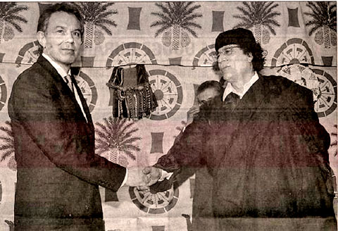 Our expert geomasonic handshake analyst writes that "the Blair-Qadhaffi handshake" is a Shibboleth Grip which denotes fellowship and total agreement. The purpose of these photographs is to tell fellow Masons that these two are 'one.' Beneath the photograph was a caption containing the following odd language: