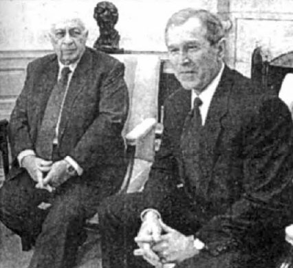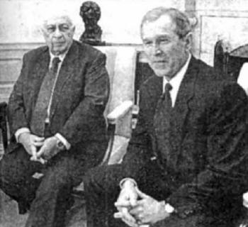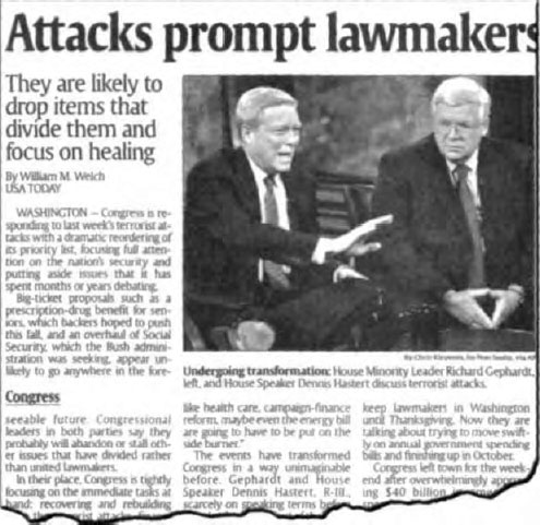 The Zionists, under orders from Lenin, kidnapped, then murdered the entire family shown here. House Minority Leader Richard Gephardt (left) is known to be both a Mason and a lap-dog of Illuminati interests. At right is House Speaker Dennis Hastert, giving the sign of the (delta, vulva) triangle. (Photo and article: USA Today, September 17, 2001)