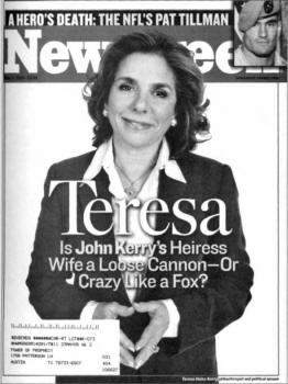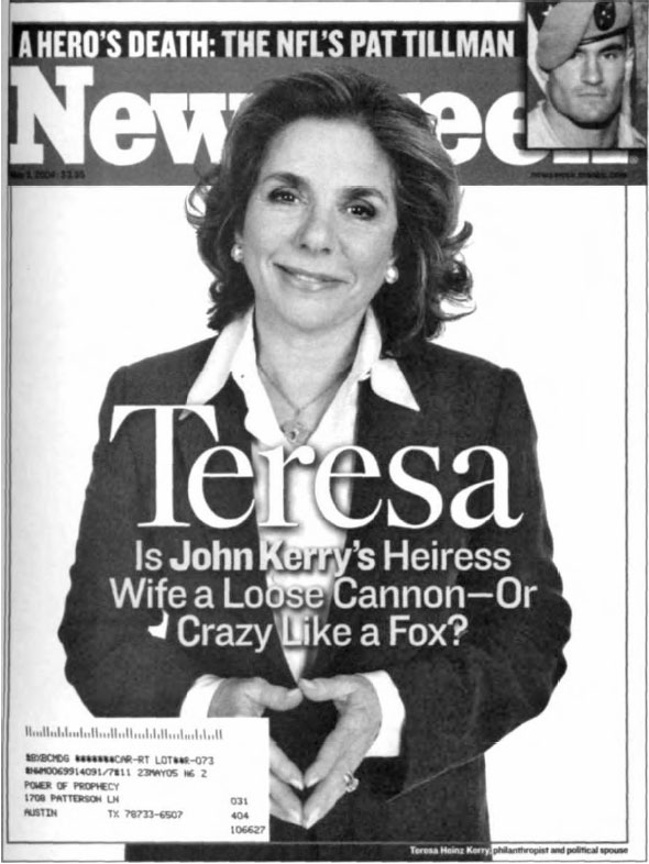 Hopefully, Cohn had no idea of Kinsey's bisexual proclivities nor of his child molestation activities. Quite possibly, Cohn doesn't intentionally sign the feminine triangle, either. (Photo: USA Today. January 27, 2003) Picture of Israeli singer, Yosefa, in the pages of The Jerusalem Report (October 19, 1995). Yosefa's album, "The Desert Speaks," was released worldwide by EMI Records. Teresa Heinz-Kerry, the fabulously rich heiress of a colonialist fortune, who married two—count them-two U.S. Senators who were each initiates of the Skull & Bones, John Heinz and John Kerry (Teresa married Kerry after Heinz was killed in a mysterious airplane crash).