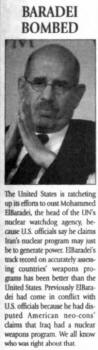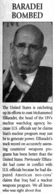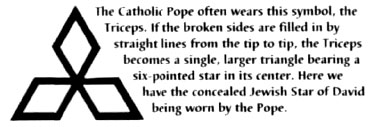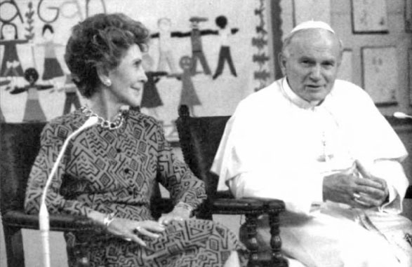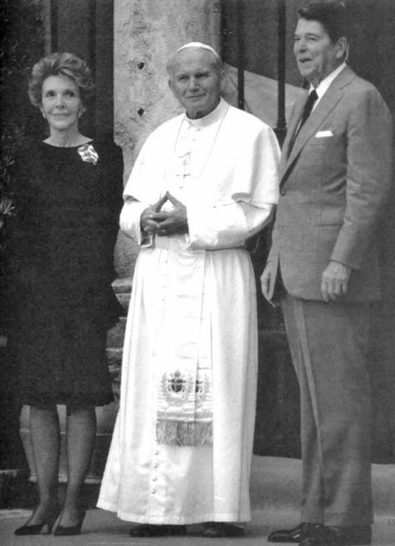 Kryuchkov's hand sign shows he has approval of Illuminati superiors for his new "Tough Guy" approach. Mohammed El Baradei, head of the United Nation's International Atomic Energy Association, the world's nuclear watchdog agency, signals with his hands that he is in league with the llluminati elite. (American Free Press, February 21, 2005, p. 2) Meeting with First Lady Nancy Reagan is Pope John Paul II. At left—the pontiff displays yet another masonic sign, that of Hand on Heart, with thumb communicating, "I'm on the square." The Pope does it again, with President Ronald Reagan and First Lady Nancy at his side.