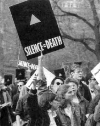 Homosexual activists have latched onto the pink-colored triangle as the chosen motif for their protests and demonstrations. On this page we find demonstrators holding up placards with the pink triangle and, at a university, the pink triangle against a black circle background on the hands of gay students.