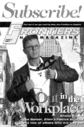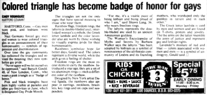 Then there is the "Subscribe!" to Frontiers magazine ad card, featuring a gay man with a rainbow-colored triangle on his chest. The newspaper clipping, "Colored Triangle Has Become Badge of Honor For Gays," comes from the Montreal, Canada, Gazette newspaper, June 28, 1992.