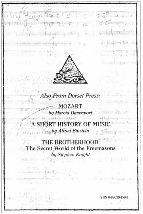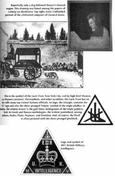 This is indicative of the Illuminati's principle of integration, or synthesis, of the dialectical process. This is the back cover of the book, Mozart and freemasonry, published by Dorset Press, a firm that publishes many masonic-related volumes. The triangle symbol is prominent. Within the triangle is the three-headed serpent, most likely representing the unholy trinity. Also, a smaller symbol, subtle and tiny, near the head of the serpent, is an image of some type of creature with a lightning bolt out of its head.