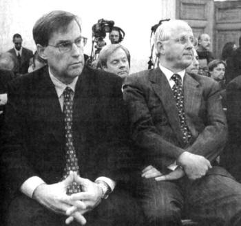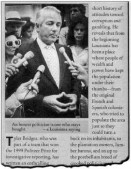 Note Frew's use of the sign of the warlock (ascendant) triangle. (Photo: SCP Newsletter, Winter 2005) Governor Edwin Edwards of Louisiana, just convicted of taking bribes and payoffs, is apparently appealing to "higher powers." Notice the caption in the clipping just under Edwards' photograph. (Photo: Oxford American, May/June 2001) Are these hand signs mere accidents, or do they convey a concealed, occult meaning? Left is Richard Buy; right is an unidentified man making the "X" with his arms and hands, while Mr. Buy is presenting the ascendant triangle. The occasion was the House Committee's hearings on the Enron Corporation's financial failure debacle.