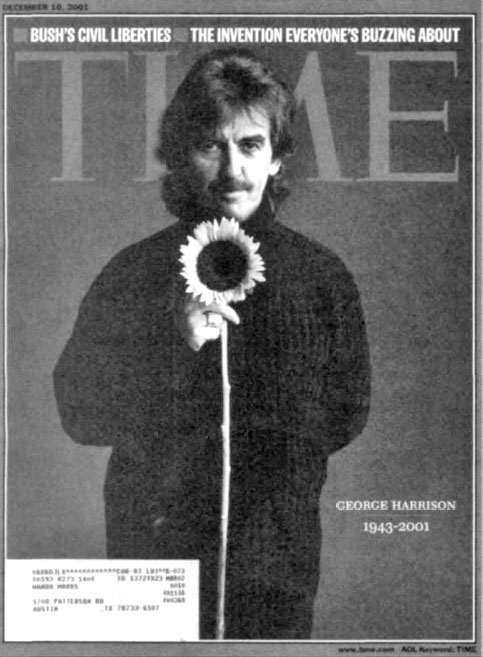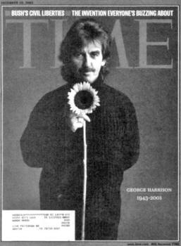 Surely, the scriptures were right on when they warned that the Devil himself often comes disguised as an "angel of light." (Note: Codex Magica has seen these pictures published in an increasing number of media forums, from Time and Newsweek to daily papers.) Upon his death, Time magazine published this telling photo of Beatle superstar George Harrison (1943-2001) on the cover of its December 10, 2001 issue. Harrison, wearing black, in a black and white photo, holds a sunflower, symbol of the Illuminati Sun God. The solar deity is also prominently worshipped in the Hindu religion, and the Beatles were devoted followers of the Maharishi Mahesh Yogi and other Indian Hindu gurus.