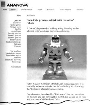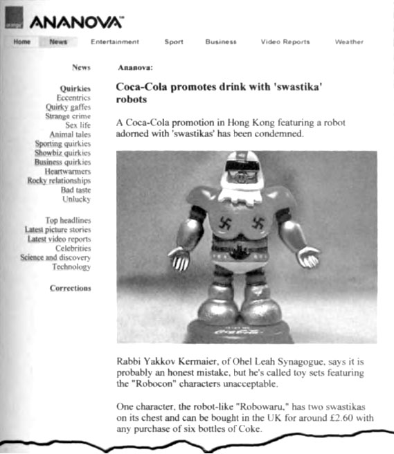 In 2003, when the Coca-Cola Company in Hong Kong ran an ad promotion featuring a robot adorned with swastikas, Jewish spokesmen balked.