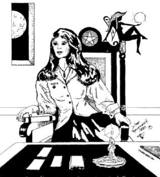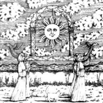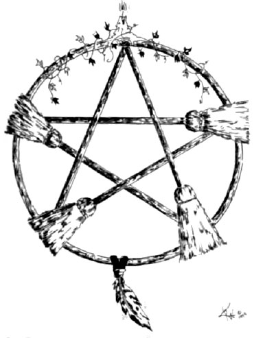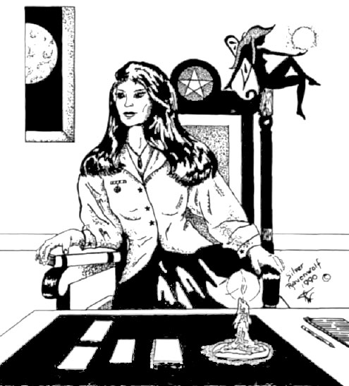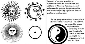 A Jewish rabbi, however, admitted, "The Nazi swastika can easily be confused with Buddhist swastikas that are common in Asia." ( Ananova.com news, May 1, 2003) Circular images of Goddess worship and sun adoration are found in many New Age and occult publications. Witches are major promoters of the Goddess revival. Above is an ad for a witch's periodic newspaper (address deleted). An interesting drawing of an upscale witch, complete with lunar force (moon in window), pentagram (on chair), naked Goddess holding the radiating sun in her left hand, and more. (From the book, To Ride a Silver Broomstick: New Generation Witchcraft, by Silver Raven Wolf, Llewellyn Publications, St. Paul, MN, 1993) (From the book, To Ride a Silver Broomstick: New Generation Witchcraft, by Silver RavenWolf)