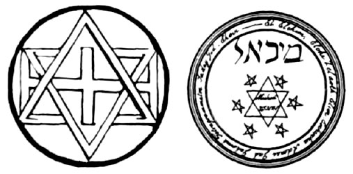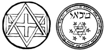 Left: magic circle with six-pointed star (hexagram) and occult cross. Right: magic circle from Francis Barrett's The Magus, London, 1901. (From The Herder Dictionary of Symbols, Chiron Publications, Wilmette, IL, 1986)