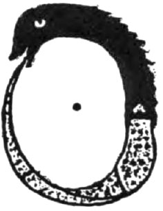 Stylized Oroboros serpent biting its tail, forming a circle with its body. Inside the circle is the point of Lucifer.