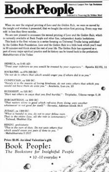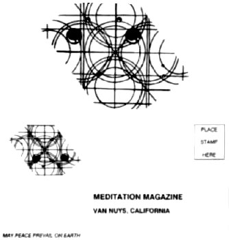 Designs on a return envelope for subscriptions of Meditation, a New Age magazine. Like many in the New Age and occult worlds, the managers of Book People, a large occult bookstore in Austin, Texas, claim their works are loving and good.
