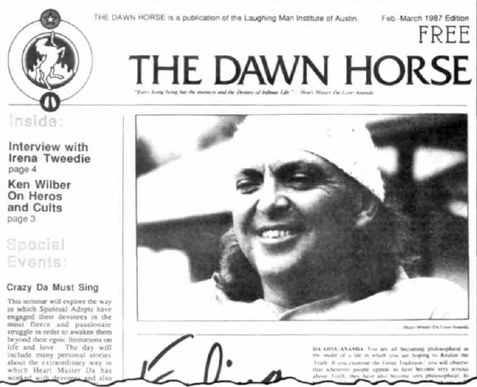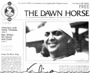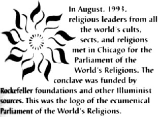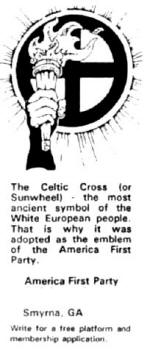 But in this revealing advertisement in the swirling astronomical spiral mist at right, is clearly seen the letter "S." As in Satan? Let the discerning reader decide. Prozac can help? Really? So why the design resembling the oroboros serpent? And is it just this author's imagination, or are the radiant sun rays in the form of number 6s? American Hindu guru DaFree John publishes The Dawn Horse newspaper with this unusual logo, consisting of circles, flames, a white horse, the occultic star and two feet (the disciple on his knees or prostrate). Celtic cross (sunwheel) and torch adopted as the emblem for the America First Party, a political party geared to the goals of the white race, headquartered in Georgia.