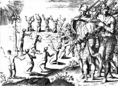 Native Americans worshipping the Sun God, bearing a totem idol. (Engraving from Theodore de Bry's America, 1590)