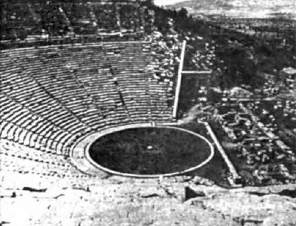 The Greek theater at Epidaurus (circa 300 B.C.) enclosed a design of circle and point within. (Photo from book, The Pattern and the Prophecy, by James Harrison, Isaiah Publications, 1994)