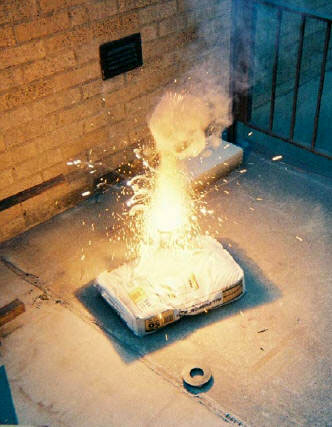 We demonstrated that the thermite reaction would not ignite at this high temperature. Later, the thermite reaction was triggered by burning a magnesium strip in contact with the thermite. An electrical superthermite “match” could have been used and remotely triggered via radio signal.