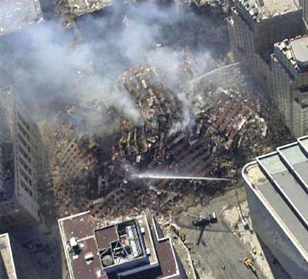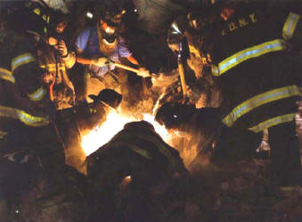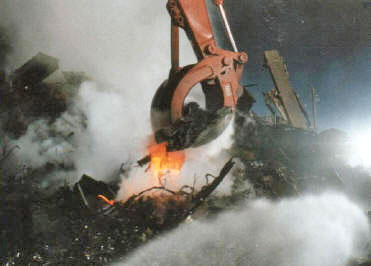 Workers evidently peering into the hot “core” under the WTC rubble. (See related BBC News). For recorded eyewitness testimony of the molten metal pools under both Towers and WTC 7, see here.