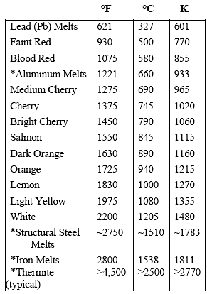 We see from the photograph above that solid metal from the WTC rubble existed at salmon-to-yellow-hot temperature (approx. 1550 - 1900 oF, 845 - 1040 oC.) The temperature is well above the melting temperatures of lead, zinc and aluminum, and these metals can evidently be ruled out since they would be runny liquids at much lower (cherry-red or below) temperatures.