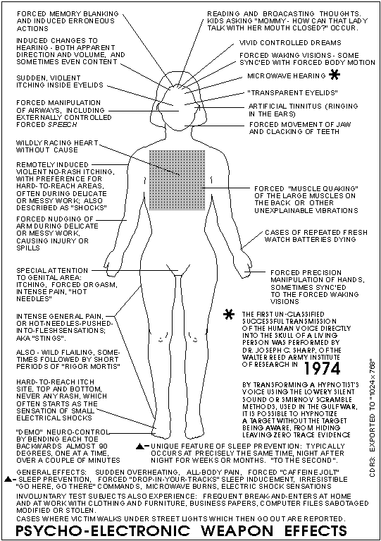 a. Sleep deprivation and fatigue i. Silent but instantaneous application of "electronic caffeine" signal, forces awake and keeps awake ii. Loud noise from neighbours, often SYNCHRONIZED to attempts to fall asleep iii.Precision-to-the-second "allowed sleep" and "forced awakening"; far too precise and repeated to be natural iv. Daytime "fatigue attacks", can force the victim to sleep and/or weaken the muscles to the point of collapse b. Audible Voice to Skull (V2S) i. Delivered remotely, at a distance ii. Made to appear as emanating from thin air iii.Voices or sound effects only the victim can hear c. Inaudible Voice to Skull (Silent Sound) i. Delivered by apparent at a distance radio signal; manifested by sudden urges to do something/go somewhere you would not otherwise want to; silent (ultrasonic) hypnosis is possible ii. Programming hypnotic "triggers" - i.e. specific phrases or other cues which cause specific involuntary actions d. Violent muscle triggering (flailing of limbs) i. Leg or arm jerks to violently force awake and keep awake ii. Whole body jerks, as if body had been hit by large jolt of electricity iii.Violent shaking of body; seemingly as if on a vibrating surface but where surface is in reality not vibrating e. Precision manipulation of body parts (slow, specific purpose) i. Manipulation of hands, forced to synchronize with closed-eyes but FULLY AWAKE vision of previous day; very powerful and coercive, not a dream ii. Slow bending almost 90 degrees BACKWARDS of one toe at a time or one finger at a time iii.Direct at-a-distance control of breathing and vocal cords; including involuntary speech iv. Spot blanking of memory, more than normal forgetfulness f. Reading said-silently-to-self thoughts i. Engineered skits where your thoughts are spoken to you by strangers on street or events requiring knowledge of what you were thinking ii. Real time reading subvocalized words, as while the victim reads a book, and BROADCASTING those words to nearby people who form an amazed audience around the victim g. Direct application of pain to body parts i. Hot-needles-deep-in-flesh sensation ii. Electric shocks (no wires whatsoever applied) iii.Powerful and unquenchable itching, often applied precisely when victim attempts to do something of a delicate or messy nature iv. "Artificial fever", sudden, no illness present v. Sudden racing heartbeat, relaxed situation h. Surveillance and tracking i. Rapping under your feet as you move about your apartment, on ceiling of apartment below ii. Thru wall radar used to monitor starting and stopping of your urination - water below turned on and off in sync with your urine stream