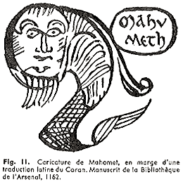 Illustration depicting a schematized Mohammed from an early medieval Latin translation of the Koran, from a manuscript in la Bibliotheque de l'Arsenal, in Paris. This may be the earliest known depiction of Mohammed, possibly dating from the mid-12th century. This reproduction is from the book Naissance de l'Europe, by Robert S. Lopez (published 1962) (taken from Deux traductions latines du Coran, by Marie-Therese D'Alverny [published 1948]).