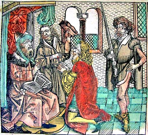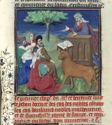 Mohammed preaching, from a medieval illuminated manuscript, with historically inaccurate landscape and clothing (a common problem in medieval and Renaissance paintings, which usually showed fashions that were contemporary with the time the painting was made, rather than showing the costumes of the era depicted)
