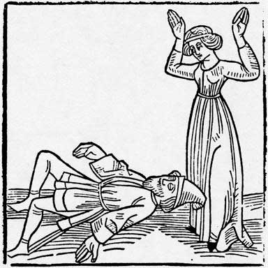 "His Wife Scolding the Drunken Mohammed," German woodcut print, c. 1481. Source (for this image and the one below): The Illustrated Bartsch. Vol. 83, German Book Illustration before 1500 Anonymous Artists, 1481-1482. Series title: Reysen und Wanderschaften durch das Gelobte Land /