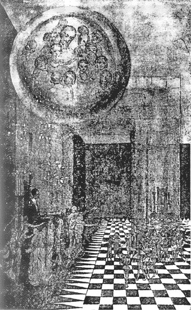 This is a masonic drawing called "The Second Portal". it shows nude boys facing a throne undergoing some type of magical ritual. The drawing appears In The Hidden Life in Freemasonry after pg. 198. in 1926, Charles W. Leadbeater, a 33º Freemason, printed his book The Hidden Life in Freemasonry. This book was written for people involved in Luciferian rituals In the higher more occult rites of Freemasonry. in the preface, Leadbeater talks of butterflies (pp viii-ix), which has the double meaning in the occult of souls (spirits). in the last chapter, chapter 10, he gives masonic rituals to Invoke angels (demons) through egyptian magic. In these Masonic temples, the checkerboard square is used in a similar fashion as a magic circle for a coven. This picture is given as a paper trail to show the sex-magic rituals that take place within various masonic groups.