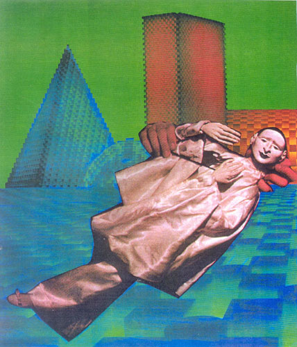 This was some early art work by Cisco to convey what her mind felt as a mind-controlled slave. What the picture shows is the hand of the puppet master controlling his puppet. The puppet is floating--not grounded in reality, but dissociated from the external world in order to survive. All the cities and internal worlds are grids. Everything attaches to grids. The color programming can be seen in the Green, Blue, Silver, Gold, Red, and Yellow colors of the grids. The puppet is totally in the hands of the puppet master and its hands are in a submissive hold, while the puppet master has his fingers covertly wrapped around the left side of the puppet's head.