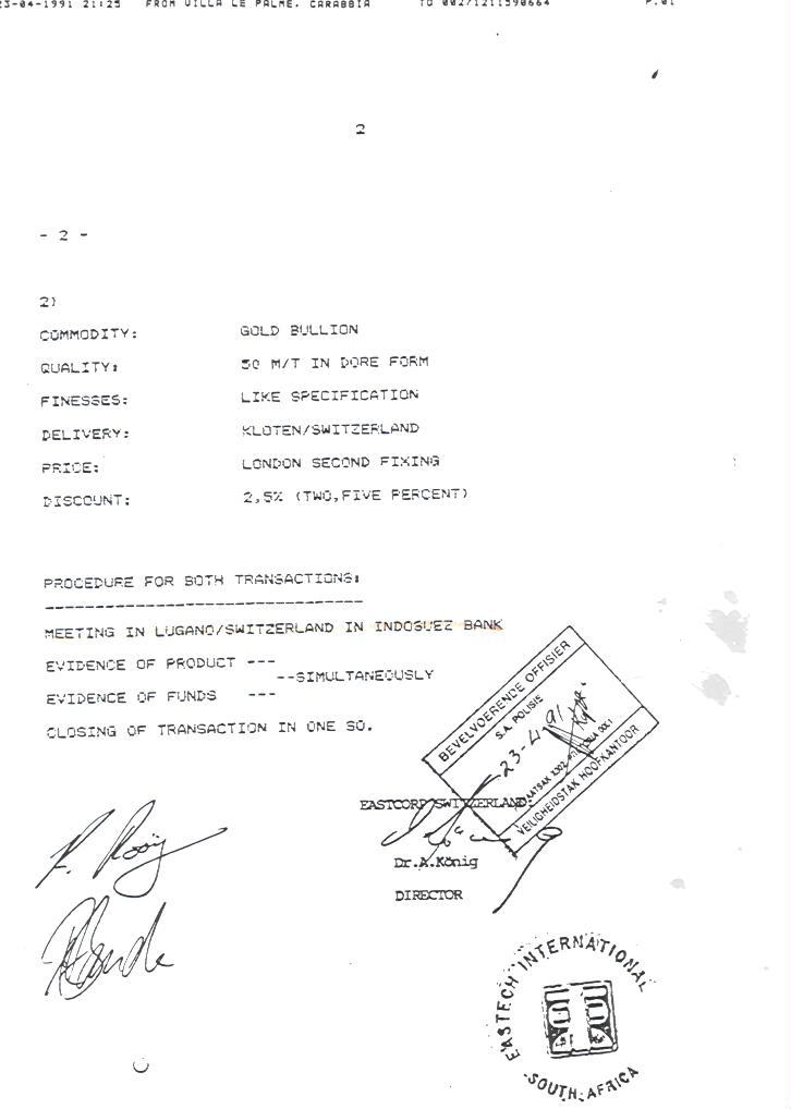 Part of a longer letter from Rolf van Rooyen and his associates concerning a 50 metric tonnes Dore gold bullion transaction to take place in the offices of Indosuez, Lugano. Note the South African Police security stamp at the bottom right.