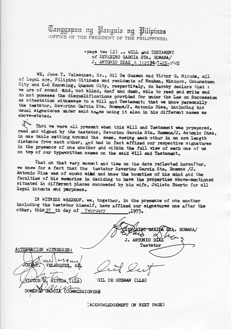 Second page of the Will & Testament of Severino Garcia Santa Romana on the Office of the President stationary. |