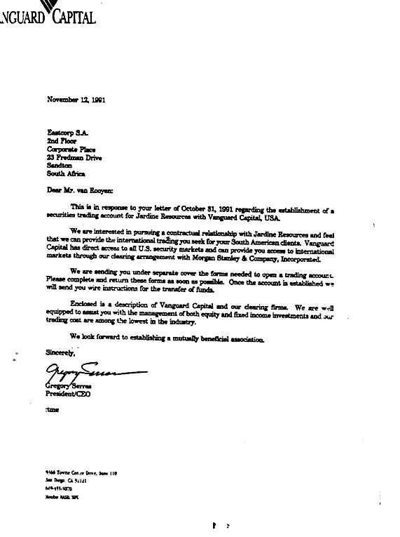 CLetter from Gregory Serras, POresident/CEO of Vanguard Capital to Rolf van Rooyen of Eastcorp regarding the establishment of a securities trading account. |