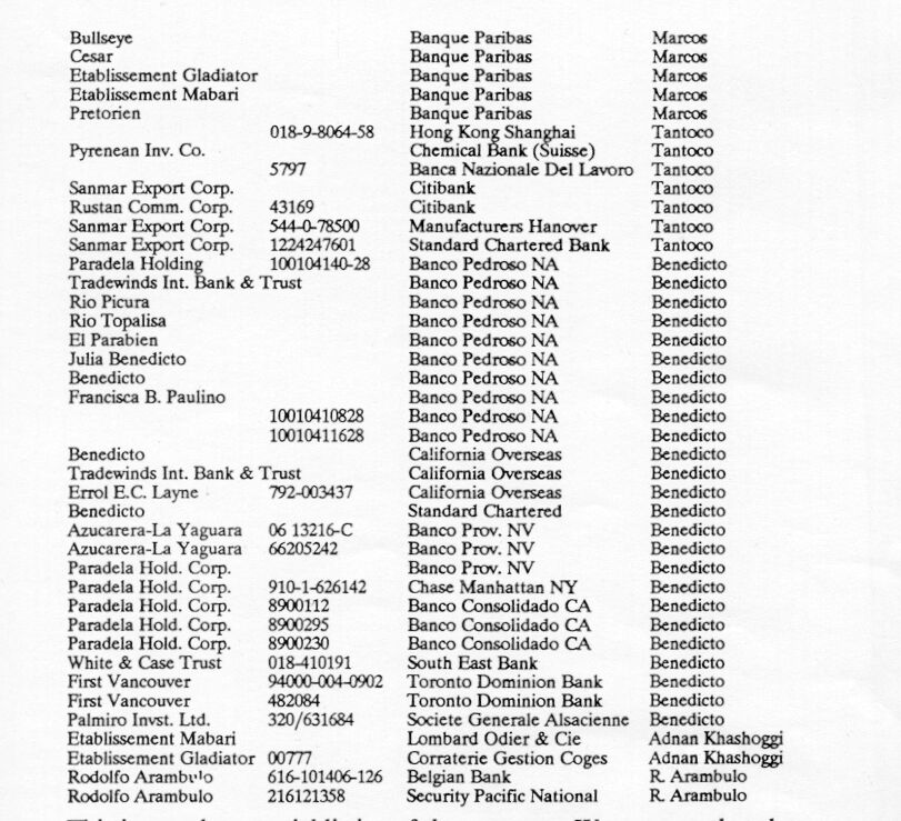 A page from a longer listing of secret Ferdinand Marcos bank accounts - including the White & Case Trust account with Southeast Bank in the name of Marcos crony Roberto Benedicto. Note also the Adnan Khashoggi accounts at the private Swiss banks of Lombard Odier & Cie and Corraterie Gestion Coges. The latter is where Marcos' personal private banker worked. Other notable hidden Marcos accounts were with HSBS, Citibank, Chase, BNL, Standard & Chartered, Security Pacific - the bank where the MidAval-Dan Hughes Hammer transaction appears to have been "back doored." Banque Paris, also listed, is said to have been heavily involved in black gold transactions. |