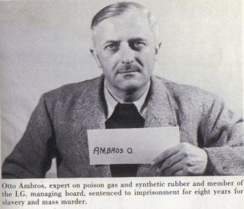 4 Borkin, op. cit, p. 115. I.G. Farben Auschwitz "Buna" Expert Otto Ambros With the Wehrmacht poised to blast its way into Russia soon, and sensing enormous profits to be made in the effort, the Farben directors decided to finance the enormous plant privately, rather than in concert with the Nazi regime, earmarking 900,000,000 Reichsmarks - nearly $250,000,000 in 1945 dollars or over $2 billion in contemporary dollars - to the project. It was to be the Buna plant to dwarf all other Buna plants. However, as the testimony at the Nuremberg War Crimes Tribunal unfolded, the Auschwitz Buna factory emerged as one of the big mysteries of the war, for in spite of the enormous sum of money set aside for its construction, in spite of the personal blessings of Hitler, Himmler, Goring, and Keitel, and in spite of an endless supply both of skilled company contract laborers and an endless supply of slave labor from Auschwitz, "the project was continually disrupted by shortages, breakdowns, and delays.... Some malign influence seemed to be affecting the entire operation" to such an extent that Farben appeared to be faced with the first failure in its long corporate history of technological success.6 By 1942, the whole effort was viewed by many directors not only as a failure, but as a near disaster.7 6 Ibid., p. 118. Disaster notwithstanding, the huge synthetic rubber and gasoline plants were completed, after 300,000 concentration camp workers had passed through the corporations construction mills. 25,000 of these inmates were simply and cruelly worked to death from exhaustion. The plants themselves were nothing less than gigantic. So gigantic, in fact, that "they used more electricity than the entire city of Berlin."8 During the war crimes tribunals, however, it was not this gruesome catalogue of facts about the plant that puzzled the Allied prosecutors. What puzzled them was that, in spite of such an enormous investment of lives, money, and material, "not a single pound of Buna was ever produced"9 The Farben directors and managers in the docks were almost obsessively insistent on this point. More electricity than the entire city of Berlin - the eighth largest in the world at that time - to produce absolutely nothing? If this was true, then the enormous outlay of capital and labor and the huge electrical consumption contributed nothing significant to the German war effort whatsoever. Needless to say, there is something very wrong with this picture.8 Ibid., p. 127. None of it made sense the, none of it makes sense now, unless of course the plant was not a Buna plant at all... When I.G. Farben began its construction of the "Buna" plant at Auschwitz, one of the more unusual events to being the process was the removal of over 10,000 Polish inhabitants from their homes to make way for the thousands of German scientists, technicians, contract works and their families who were moved into the area. The parallel with the Manhattan Project in this respect is obvious. It is simply unbelievable in the extreme that, with such a technical and scientific effort on the part of the corporation with the most successful track record in advanced technologies and production facilities, and a plant consuming more electricity than Berlin, that nothing whatsoever was ever accomplished or produced.10 One contemporary researcher who is also mystified by the whole "Buna plant affair" is Carter P. Hydrick. Contacting Ed Landry, an expert in the field of synthetic rubber production from Houston, Texas, and informing him of the I.G. Farben plant, its huge electrical consumption, and the directors' claims that it produced no Buna at all, Landry responded: "That was not a rubber plant - you can bet your bottom dollar on that." Landry simply does not believe the primary purpose of the "Buna plant" was the production of rubber at all.11 How then to account for the enormous electrical consumption and post-war insistence of Farben directors that the plant never produced any synthetic rubber at all? What other technology would require such enormous electrical power consumption, such an enormous technical and unskilled labor staff, and such close proximity to plentiful water supplies? At that time, there was only one other technological process that could conceivably require all these things. Hydrick puts the case this way: