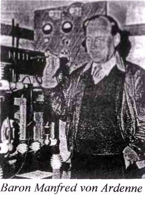 (2) (3) The Bagge-Korsching-von Ardenne-Houtermanns circle, developing an array of advanced separation technologies, and apparently, via von Ardenne, tied somehow to, of all things, the German postal service! Why the Reichspost? For one thing, it afforded an effective cover for the program, which, like its American counterpart, appears to have been compartmentalized under a number of government agencies, many having no plausible connection with a large secret weapons research effort. Secondly, and more significantly, the Reichspost was awash with money, and could therefore have provided some of the massive funding necessary to the project, a true "black budget" operation in every sense. And finally, the head of the Reichspost was, perhaps not coincidentally, an engineer: Dr. Ing. Ohnesorge. It is, from the German point of view, a logical choice. Even his last name, "Ohnesorge", meaning "without sorrow or regret", is an ironic twist to the story. What was the method of separation and enrichment developed by von Ardenne and Houtermanns? Very simply, it was the cyclotron itself. Von Ardenne had invented a modification of the cyclotron - electromagnetic separation tanks - very similar to Ernst O. Lawrence's "beta calutrons" in the United States. It is to be noted, however, that von Ardenne had completed his modifications in April of 1942, whereas General Groves in the Manhattan Project would not have Lawrence's beta calutron at Oak Ridge for fully a year and a half after that!23