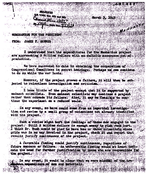 In any case, word of the Manhattan Project's difficulties apparently leaked in the Washington DC political community, for United States Senator James F. Byrnes got in on the act, writing a memorandum to President Franklin D. Roosevelt, and confirming that the Manhattan Project was perceived - at least by some in the know - as being in danger of failure: