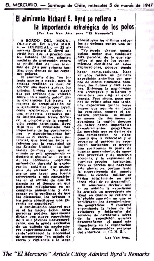 Byrd was returned to Washington DC, debriefed, and his personal and operational logs from the mission were seized and remain classified to this day, fueling an endless stream of rumors and conspiracy theories. But the expedition, in keeping with its cover as a mapping expedition perhaps, was composed also of small contingents of news media and reporters from other countries, one of which was Chile. A reporter working for the Chilean El Mercurio in Santiago, one Lee van Atta, accompanied Admiral Byrd, who "made some astounding statements, all dutifully recorded" and reported by van Atta, and dutifully ignored in the American press.16