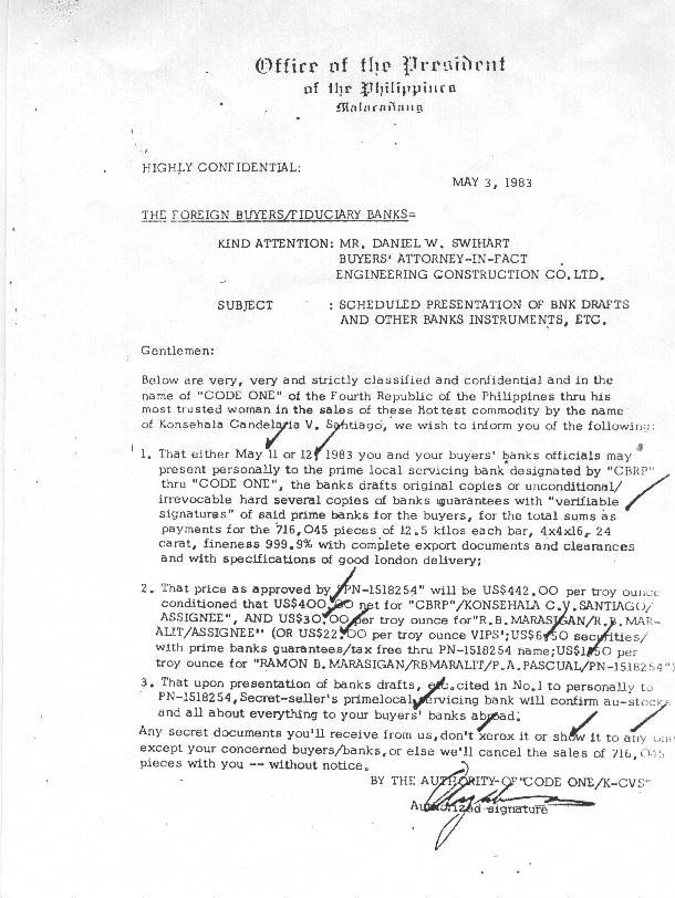 Letter on Presidential letterhead and issued by "CODE ONE" ( Ferdinand Marcos) through his "most trusted woman" Konsehala Candelaria V. Santiago for a large gold deal.