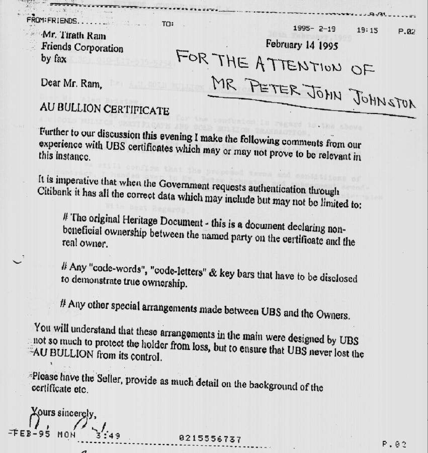 Letter from Tirath Ram's "contact" providing background on Johnston's certificates.