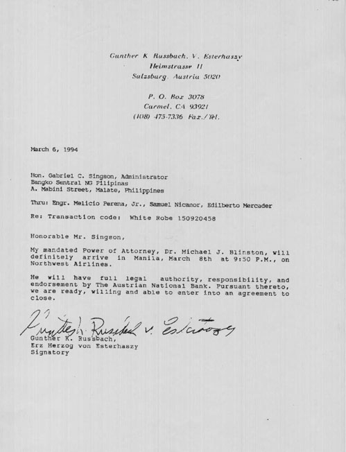 Letter from Gunther Russbacher to Gabriel Singson of the Philippine Central Bank stating that his colleague, Michael Blinston will be arriving in Manila with a letter of authority from the Austrian Central Bank in regard to a massive gold transaction.