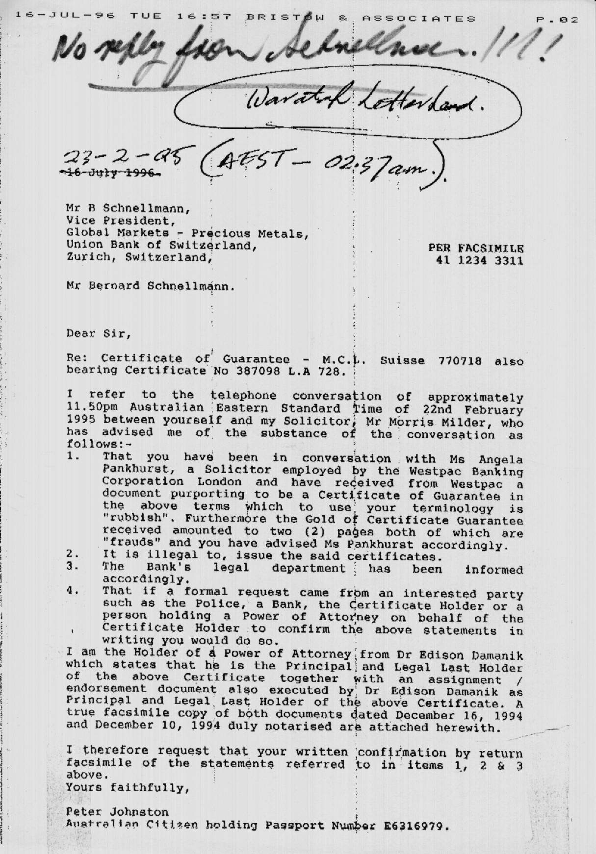 received no reply from Mr. Schnellmann or any other