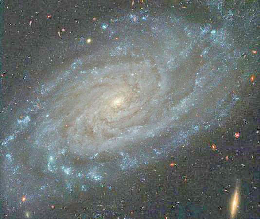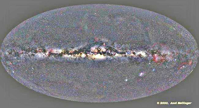 It is a view looking from inside the galactic disk. An all sky (panoramic) view is shown in Figure 05-12. If we could fly away from the Milky Way and look back, the view would be similar to the spiral galaxy NGC 3370 as depicted in Figure 05-13. Similar in size to our own Milky Way, spiral galaxy NGC 3370 lies about 100 million light-years away toward the constellation Leo. It contains a mixture of young stars in the bluer regions and an older population in the yellowish center.