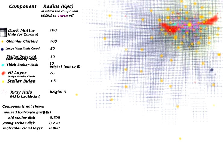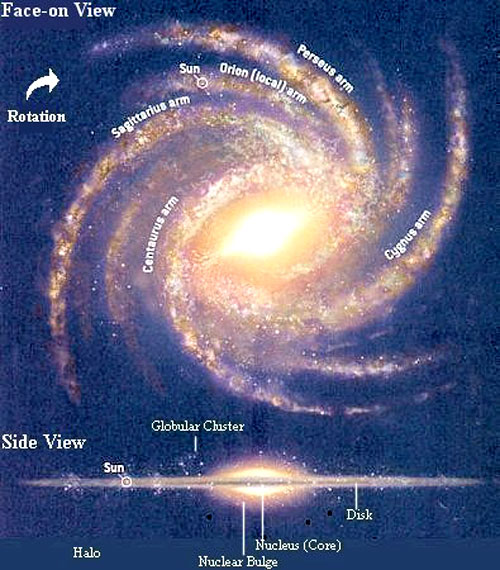 The total mass of NGC 3370 and the Milky Way is estimated to be several 1011 solar mass. The main components of the Milky Way consist of a nucleus at the center, a nuclear bulge, a disk in the form of spiral arms winding around this nucleus, and a halo, which covers both the nucleus, the disk, and contains a spherical distribution of globular clusters (see below