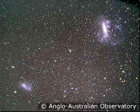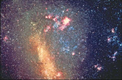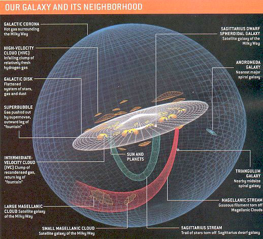 by astronomers many years ago. It is observed that most galaxies formed from the merging of smaller precursors, and in the case of the Milky Way, we can observe the final stages of this process. As shown in Figure 05-16a, the Milky Way is tearing apart small satellite galaxies (such as the Large and Small Magellanic Clouds - click below images) and incorporating their stars. Meanwhile hot intergalactic gas clouds are continually arriving from intergalactic space. The evidence for the continuing accretion of gas by the Milky Way involves high-velocity clouds (HVCs) - mysterious clumps of hydrogen, up to 10 million solar mass and 10,000 ly across, moving rapidly (from 90 to 400 km/sec) through the outer regions of the galaxy. These materials form the reservoir from which the Milky Way can draw on to make new stars.